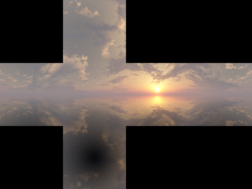 Cubemap skyboxes have been rendered using 512x512 frames and assembled into 2048x1536 horizontal cross cubemaps, but can easily be split into individual frames.
